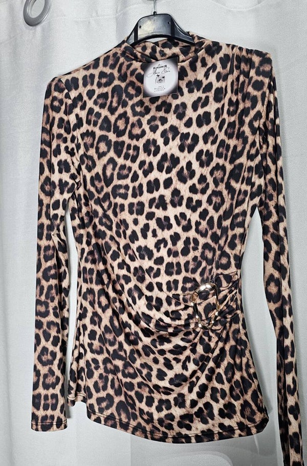 Camiseta manga larga con detalle dorado en el lateral y cuello a la caja. disponible en tres colores, Beige, negra y animal print. Talla única, puede dar de una 36 hasta una 42